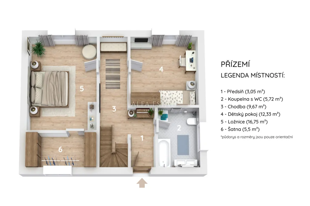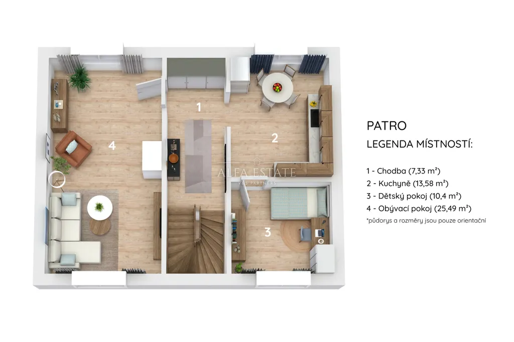 1. patro: hala, kuchyň, dětský pokoj, prostorný obývací pokoj