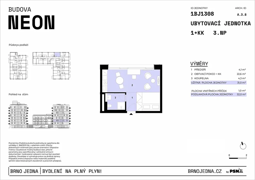 Jednotka č. 1308 o dispozici 1+kk a celkové ploše 32 m² vám nabídne harmonický prostor pro život, ať už hledáte vlastní zázemí, nebo investiční příležitost. Jednotka v 3. podlaží zahrnuje obytný prostor s přípravou na kuchyňský kout, elegantní koupelnu se sprchovým koutem a toaletou a vstupní část s místem pro úložné řešení. K jednotce je třeba zakoupit sklepní kóji a parkovací stání. Byt bude připraven k okamžitému nastěhování s dokončenými podlahami, vybavenou koupelnou a připraveným prostorem pro kuchyňskou linku. Vyšší standard zahrnuje kvalitní materiály, trojskla a u vybraných jednotek i přípravu na venkovní stínění.