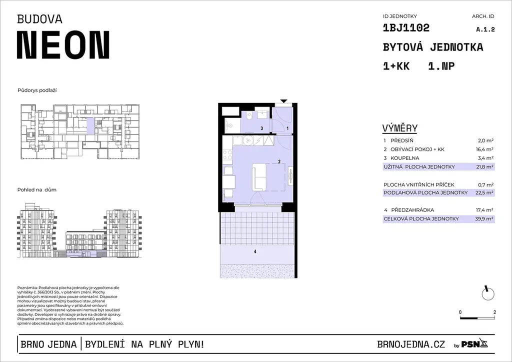 Jednotka č. 1102 o dispozici 1+kk a celkové ploše 39.90 m² vám nabídne harmonický prostor pro život, ať už hledáte vlastní zázemí, nebo investiční příležitost. Jednotka v 1. podlaží zahrnuje obytný prostor s přípravou na kuchyňský kout, elegantní koupelnu se sprchovým koutem a toaletou a vstupní část s místem pro úložné řešení. Díky orientaci na J je byt krásně prosvětlený po celý den. Součástí jednotky je předzahrádka, abyste si mohli vychutnat ranní kávu na čerstvém vzduchu nebo pěstovat bylinky. K jednotce je třeba zakoupit sklepní kóji a parkovací stání. Byt bude připraven k okamžitému nastěhování s dokončenými podlahami, vybavenou koupelnou a připraveným prostorem pro kuchyňskou linku. Vyšší standard zahrnuje kvalitní materiály, trojskla a u vybraných jednotek i přípravu na venkovní stínění.