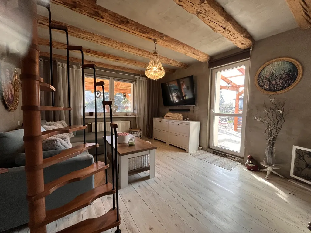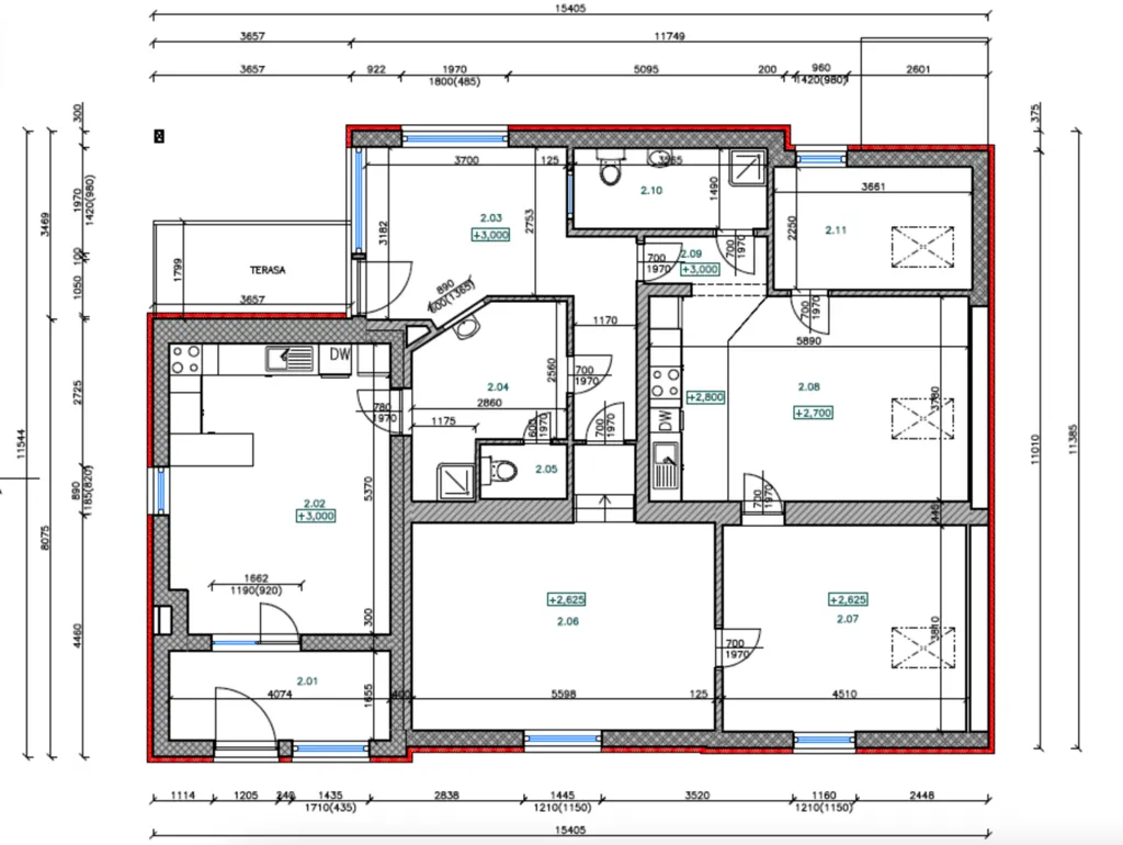 Přízemí: byt 2+1 (73 m2) se šatnou, koupelnou, WC a vstupem na prostornou terasu (cca 30 m²).