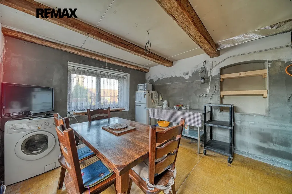 Dům je dispozičně řešen jako 3+kk. V hlavní místnosti proběhla rekonstrukce, jsou zde udělané nové stropy s přiznanými trámy, kvalitní plastová okna – trojskla v barvě a krbová kamna s výkonem 12 kW. Místnost je připravena na osazení kuchyňskou linkou. Chodbou projdeme do ložnice a dalšího pokoje. Zadní pokoj má hezkou dřevěnou podlahu.