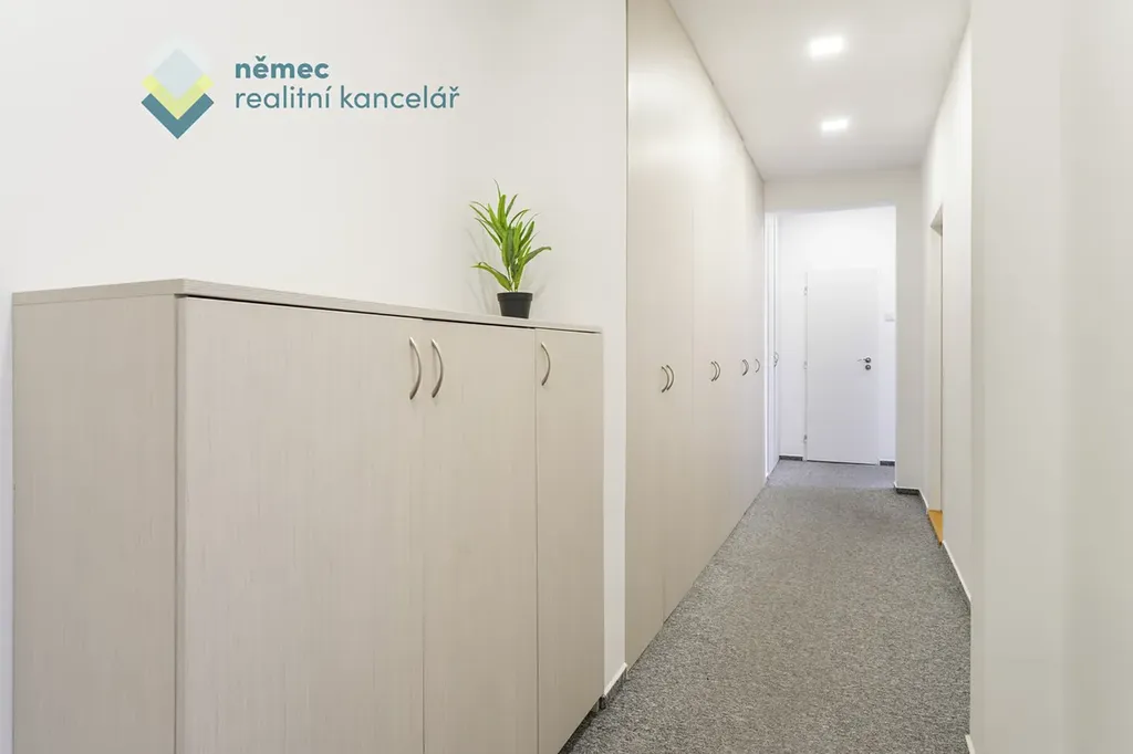 Chodba (14,74 m²)– oddělená vchodová zóna s dlažbou, čistá zóna se zátěžovým kobercem, vestavěné skříně, podhled s LED panely. Nové rozvody elektro vedené v podhledu.