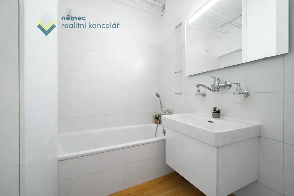 Koupelna (3,10 m²) – kvalitní vana Kaldewei Saniform Plus 170x70 cm smaltovaná ocel s Perl-effektem, prostorné umyvadlo Laufen Pro S 60×46,5 cm s velkým zrcadlem se světlem, koupelnová vestavěná skříň na hygienické potřeby, poličky s LED osvětlením za vanou. Příprava na hlubokou pračku i sušičku.