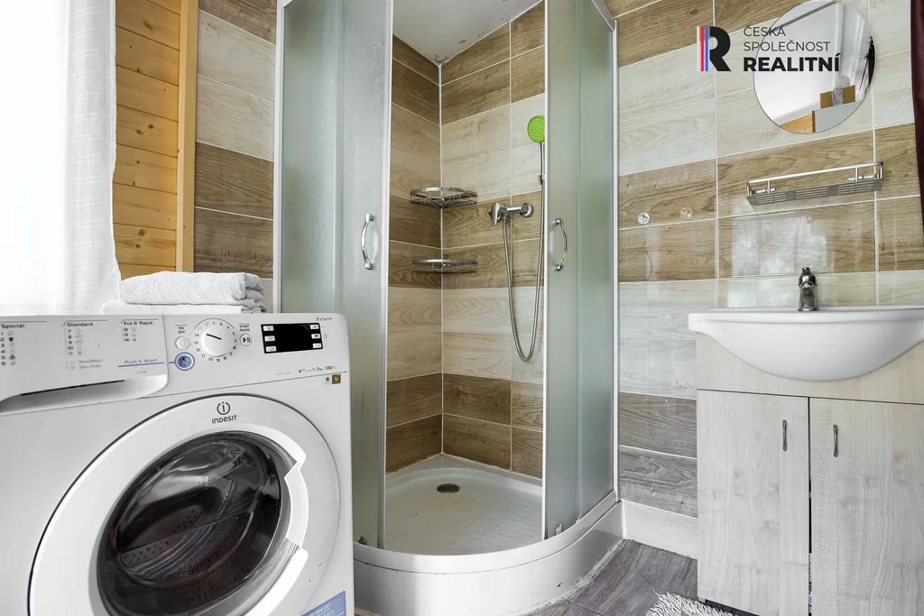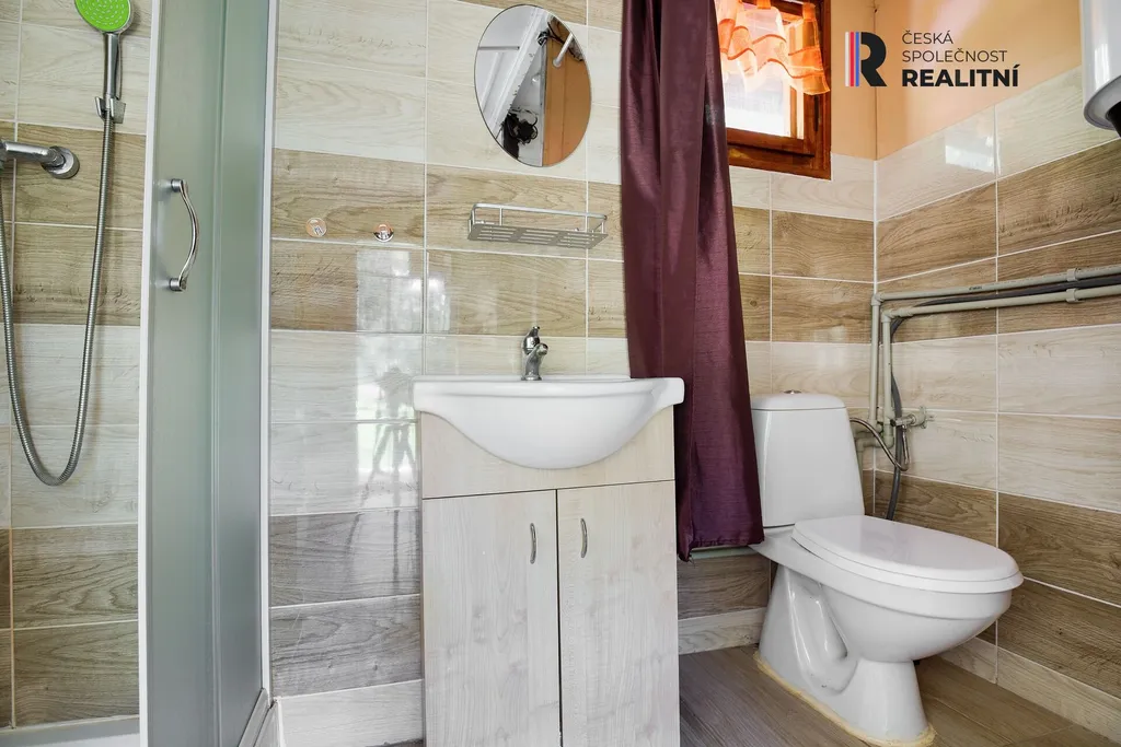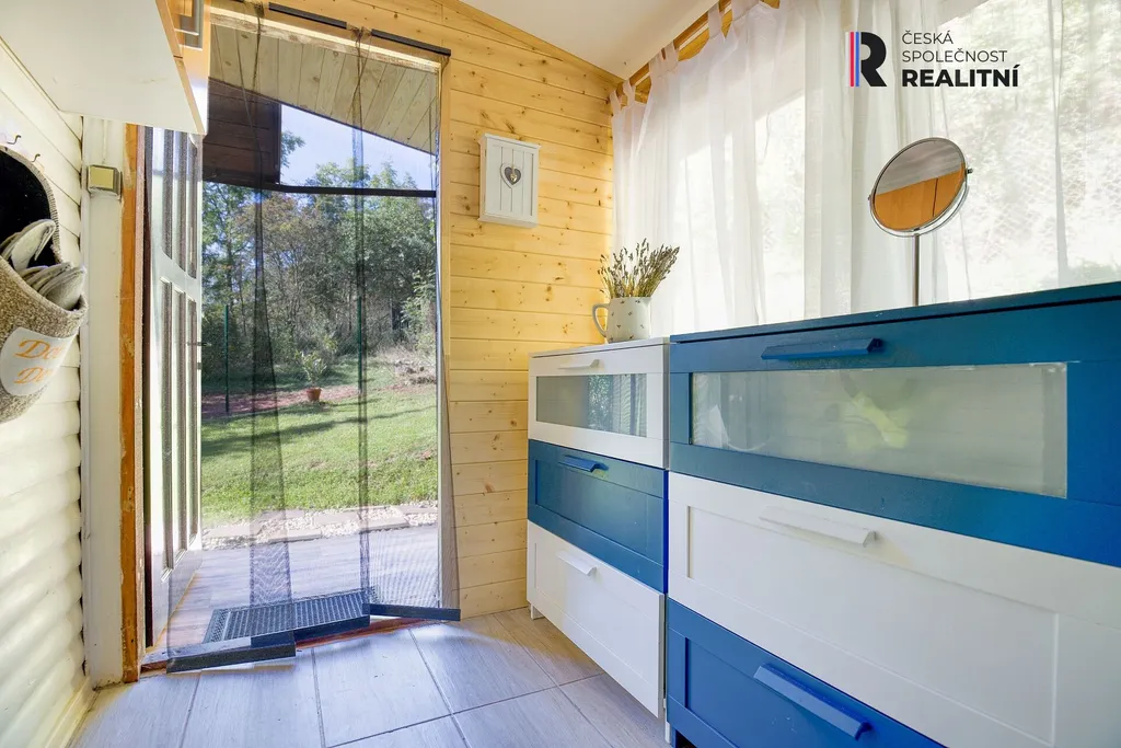 Rozvody vody, odpady, koupelna (sprchový kout, splachovací WC, bojler, místo pro pračku). Na pozemku je 27m hluboký vrt z roku 2019, který zásobuje dostatečným množstvím vody i v suchých měsících.