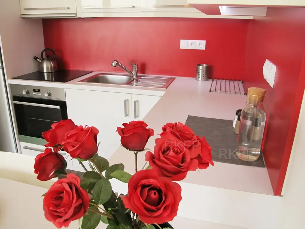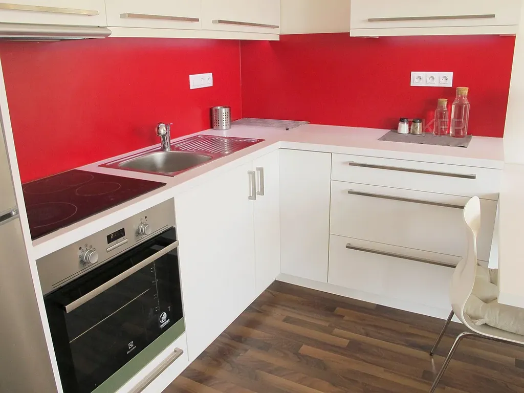 Tento moderní byt sestává z pokoje s kuchyňským koutem a balkónem, koupelny s WC a předsíně. Kuchyňský kout je vybavený moderní kuchyňskou linkou s vestavěnými spotřebiči - sklokeramickou elektrickou varnou deskou, elektrickou pečicí troubou, lednicí s mrazákem a nerezovou digestoří. V pokoji je rozkládací lůžko, konferenční stolek a jídelní stůl s židlemi. V koupelně se nachází umyvadlo, prostorný sprchový kout, WC a pračka. Díky prostorným vestavěným skříním v pokoji a předsíni skýtá byt velké množství úložných prostor.