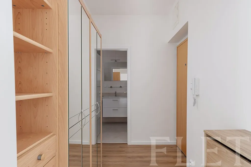Dispozice bytu zahrnuje obývací pokoj s kuchyňským koutem a samostatnou ložnici. Kuchyňská linka je vybavena varnou deskou, troubou, digestoří a lednicí s mrazákem. Součástí prostoru je také barový stolek se dvěma židlemi. V předsíni se nachází vestavěné skříně a další úložné prostory. Praktickým benefitem bytu je samostatná šatna s policovým systémem, která nabízí dostatek místa pro uložení věcí. Koupelna je po kompletní rekonstrukci a disponuje vanou, toaletou, umyvadlem, pračkou, úložnými skříňkami a topným žebříkem.