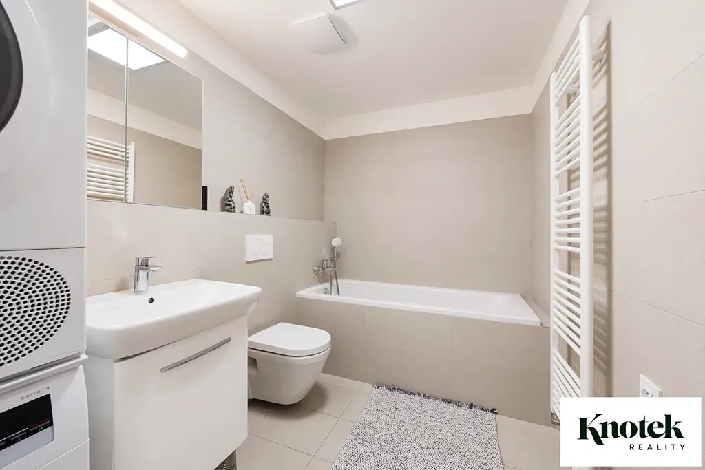 Byt je vybaven kvalitní kuchyňskou linkou se spotřebiči a ostrůvkem. V ložnici a v chodbě jsou vestavěné skříně na míru. V koupelně s odvětráváním je vana, WC a dostatek místa pro pračku i sušičku. Plastová okna s trojskly disponují venkovními žaluziemi ovládanými přes chytrou domácnost, což společně s kvalitní izolací udržuje stabilní teplotu v bytě. Ústřední vytápění a ohřev vody jsou zajištěny prostřednictvím výměníkové stanice v domě. V jednotlivých místnostech jsou radiátory, v koupelně je topný žebřík.