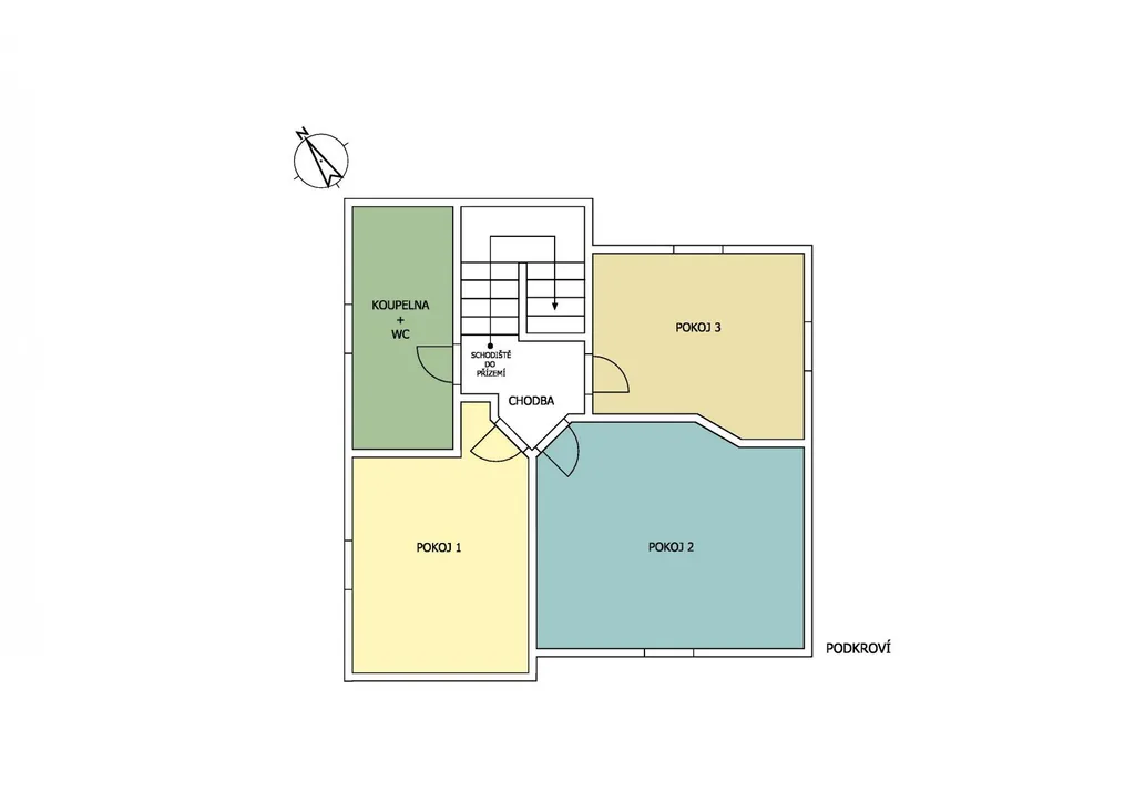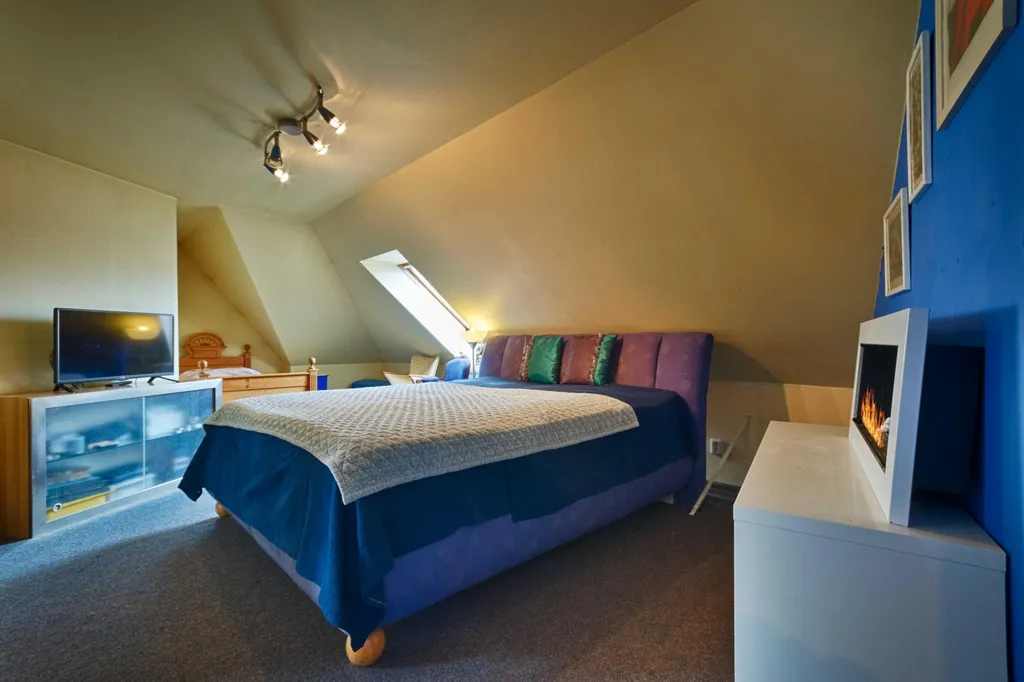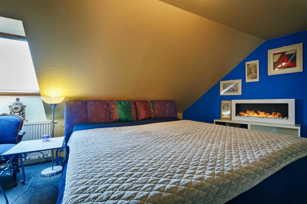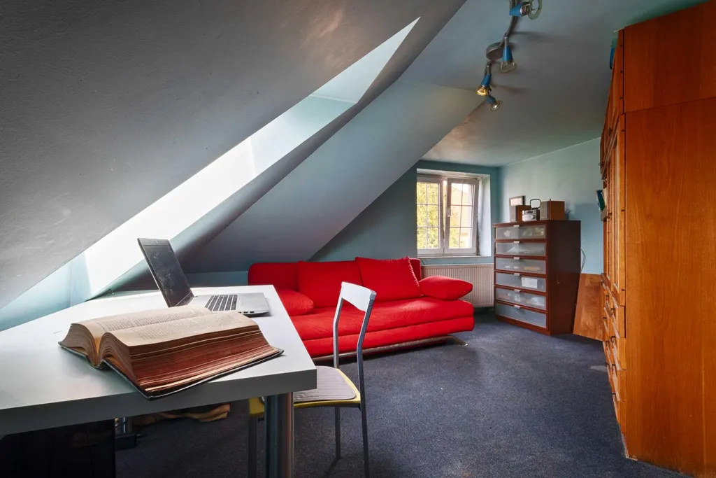Jakmile po schodišti vystoupáte z přízemí do prvního patra, nabídnou se vám útulné podkrovní místnosti. Je tu koupelna s vanou a další tři pokoje, sloužící aktuálně jako ložnice. První ložnici s dřevěnými trámy je možné stavebními úpravami proměnit na kuchyni. Při větších úpravách je tedy možné v domě vytvořit dvougenerační bydlení, zatímco ve své stávající podobě je ideální pro rodinu s dětmi, jež mohou mít v horní části své vlastní království.
