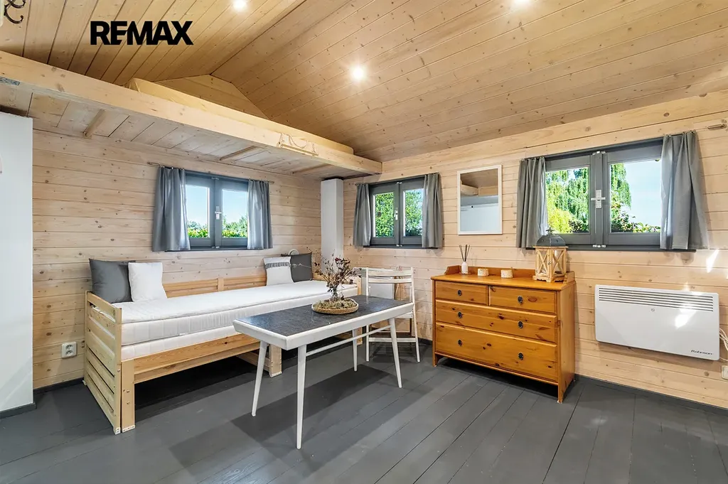 - vybavení: dřevěná podlaha, dřevěná okna, kuchyňská linka s přípojkou na myčku, umyvadlo, sprcha a WC, šatna s místem na pračku, lednice, TV