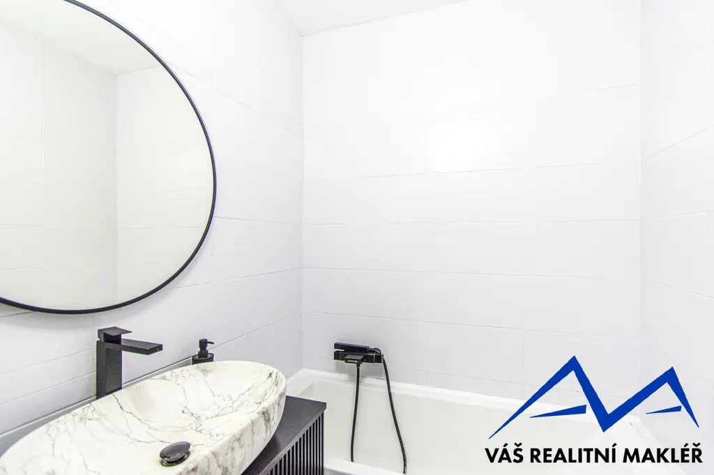 Koupelna je řešena s vanou v keramickém obkladu, toaleta je oddělena. Samozřejmostí jsou nové zárubně, interiérové dveře a bezpečnostní protipožární vstupní dveře.