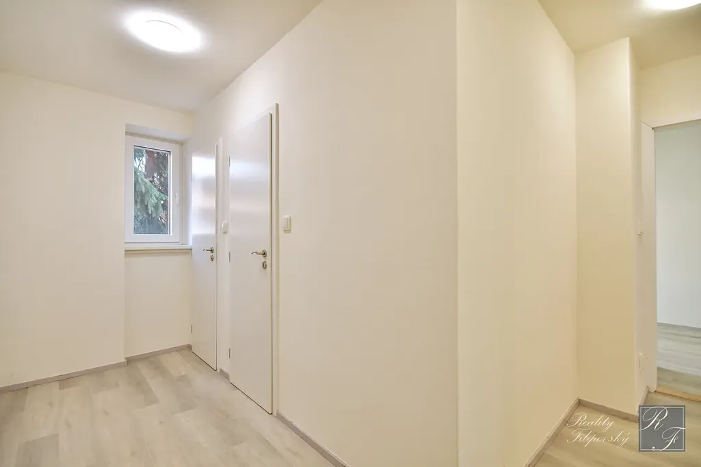 Byt právě prošel rekonstrukcí a budete tak prvními nájemci od jejího dokončení. Byt je vybaven kuchyňskou linkou s vestavnými spotřebiči a přípravou pro umístění myčky nádobí. Dále je součástí vybavení lednice s mrazákem, spížní skříň a automatická pračka. Byt je velmi dobře dispozičně řešen a nabízí spoustu místa pro úložné prostory. Na podlahách jsou parkety a dlažba.