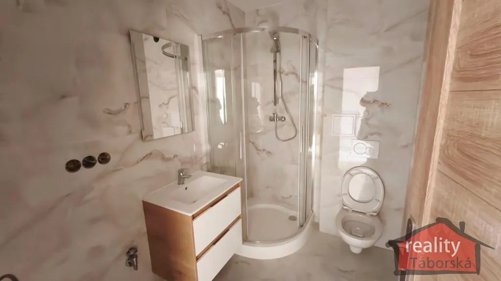 V koupelně je sprchový kout, umyvadlo se skříňkou, osvětlené zrcadlo, topné těleso, toaleta a prostor na pračku s připravenými vývody na vodu a odpad.