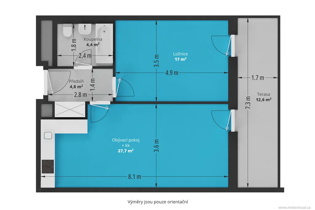 V bytě je dále prostorná ložnice o výměře 17 m², která má také přístup na terasu.