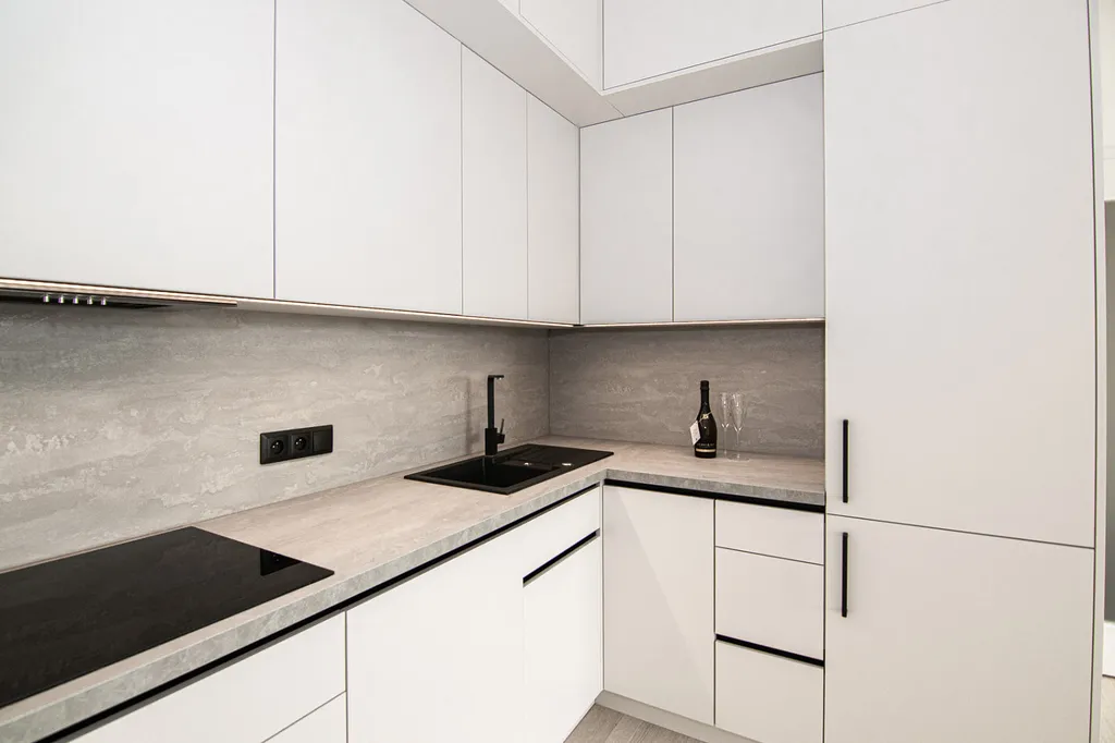 Kuchyňská linka do tvaru L je vyrobena na míru truhlářem a je plně vybavena vestavěnými spotřebiči– lednicí s mrazákem, myčkou, indukční varnou deskou, digestoří, elektrickou troubou a mikrovlnnou troubou.