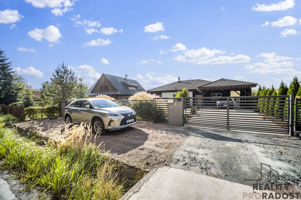 Před domem se nachází parkovací místo a zastřešený přístřešek, díky kterému lze parkovat pod střechou a vstupovat do domu suchou nohou. Vjezdová brána je na dálkové ovládání.