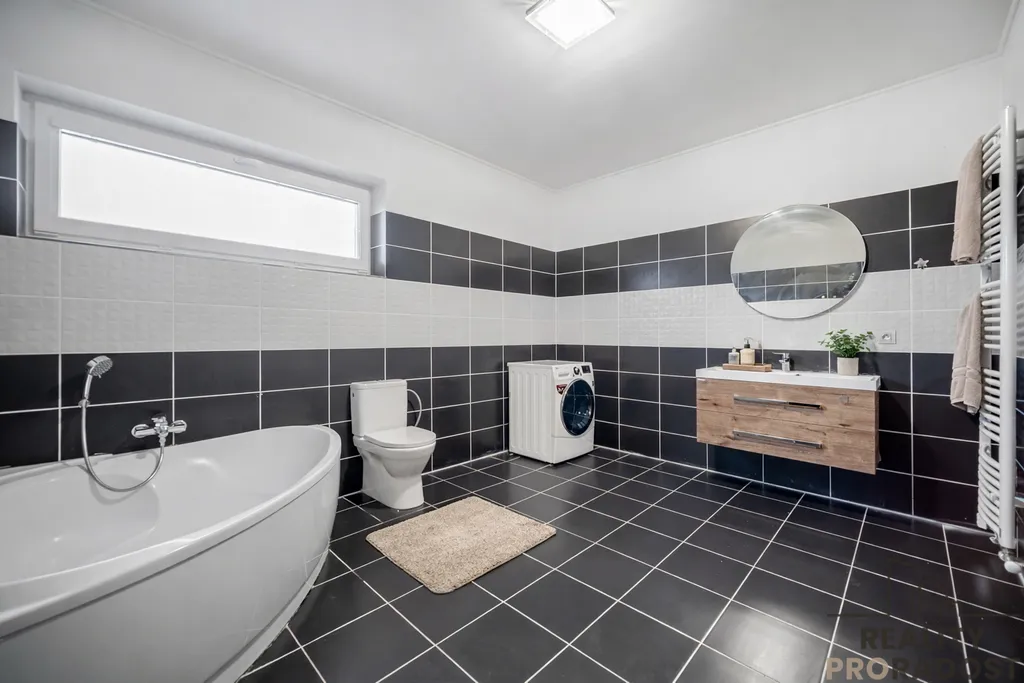 Pravá, klidová část domu zahrnuje pracovnu / kancelář, ložnici, dva dětské pokoje a dvě koupelny – jednu s vanou a druhou se sprchovým koutem.
