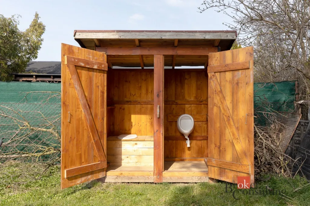 Na pozemku se nachází dvě dřevěné chatky, samostatné WC a příjemné venkovní posezení, které poskytuje ideální zázemí pro relaxaci i rodinné trávení volného času.