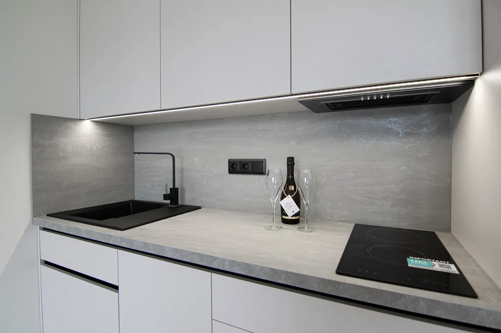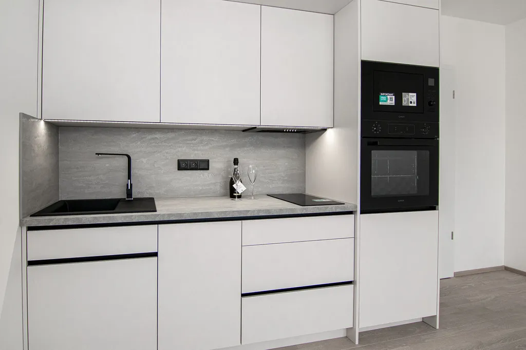 Kuchyňská linka je vyrobena na míru truhlářem a je plně vybavena vestavěnými spotřebiči – lednicí s mrazákem, myčkou, indukční varnou deskou, digestoří, elektrickou troubou a mikrovlnnou troubou.