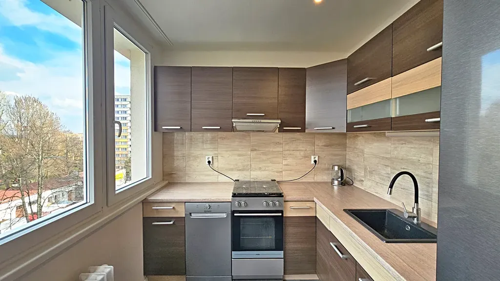 Z obývacího pokoje je vstup na lodžii s příjemným výhledem do zeleně. Kuchyň je praktická s úložnými prostory a dostatkem pracovní plochy. Ložnice je vzdušná s místem pro skříně a další úložné prostory.