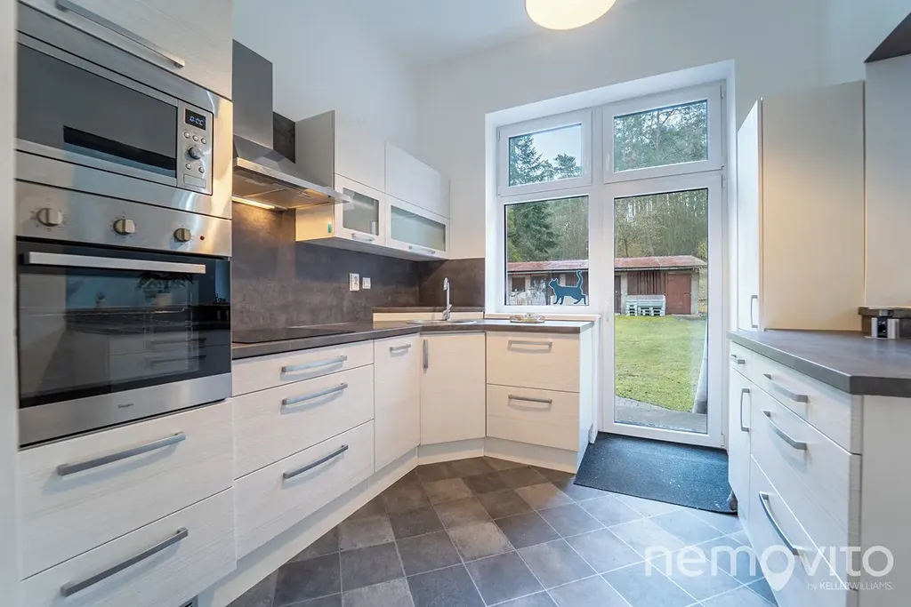 Kuchyně je prakticky řešená a vybavená vším, co potřebujete pro každodenní fungování – varná deska, trouba, mikrovlnná trouba, digestoř i myčka. A právě z kuchyně se dostanete zadním vchodem ven, kde na vás čeká příjemné posezení pod pergolou a kousek zahrádky. Ideální místo na ranní kávu, letní večeře nebo chvíle klidu po práci.