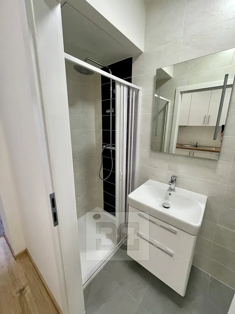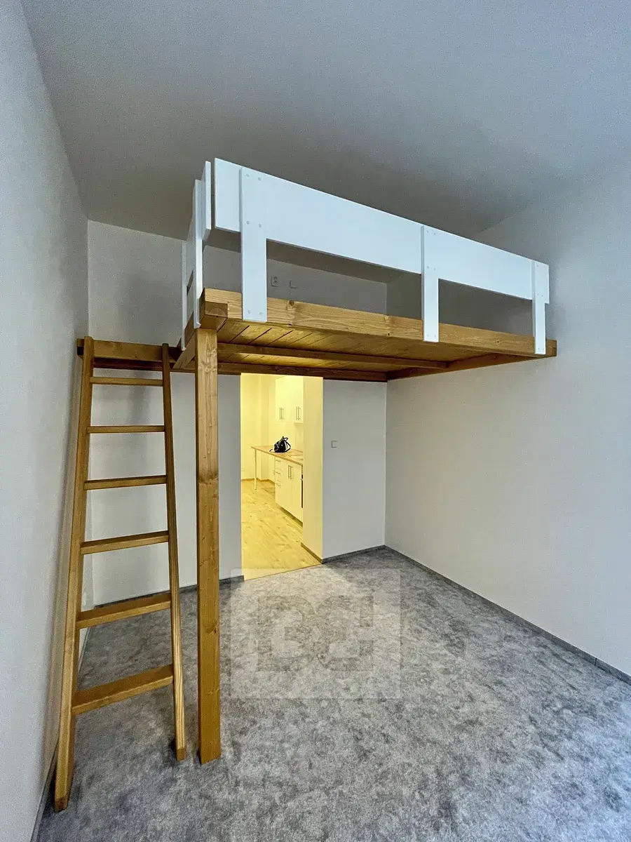 Nachází ve 2NP s výtahem a sestává ze vstupní chodby, součástí které je moderně vybavena kuchyň (elektrická varná deska a elektr. trouba a digestoř, lednice a pračka. Z předsíně je vstup do koupelny se sprchovým koutem a WC a dále pak do pokoje, kde je vystavěno patro na spaní (2 x 2 m)