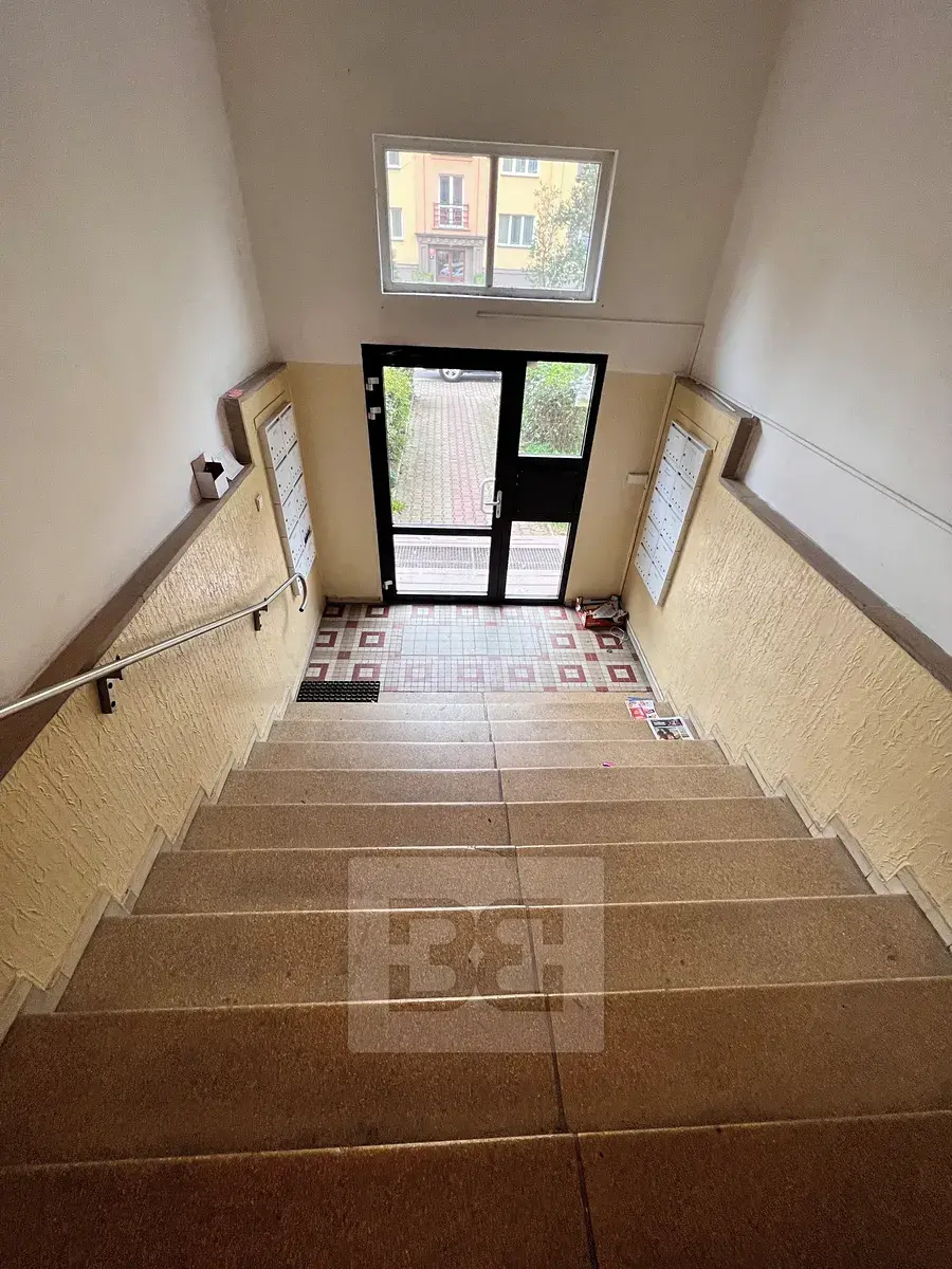 Byt se nachází v 1. patře domu bez výtahu. Skládá se ze vstupní haly, odkud je vstup do samostatné ložnice a dále obývacího pokoje s kuchyňským koutem (vybaveným kuchyňskou linkou, elektrickou varnou deskou, troubou, digestoří, myčkou nádobí, mikrovlnkou a lednicí s mrazákem), odkud je vstup do malé chodbičky, ze které vejdete do prostorné koupelny s velkým sprchovým koutem a WC a dále je z chodbičky vstup do další ložnice (na podlaze koberec). V ostatních pokojích na podlaze dřevěné parkety, v předsíni dlažba. Byt je vybaven pračkou a částečně vybaven nábytkem, jak vidíte na fotografiích.
