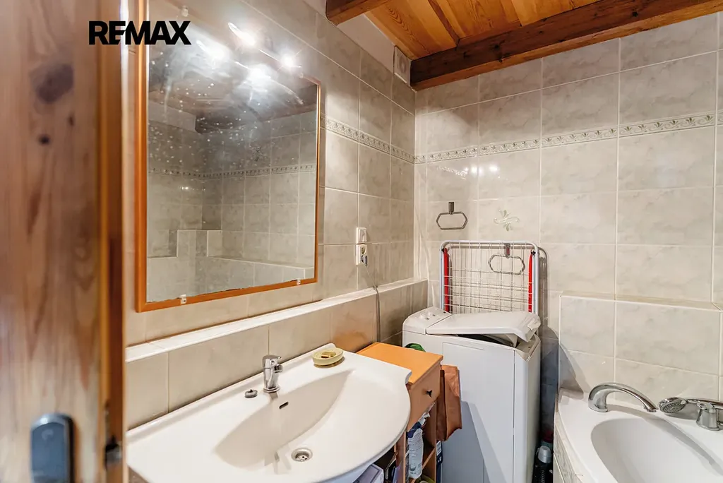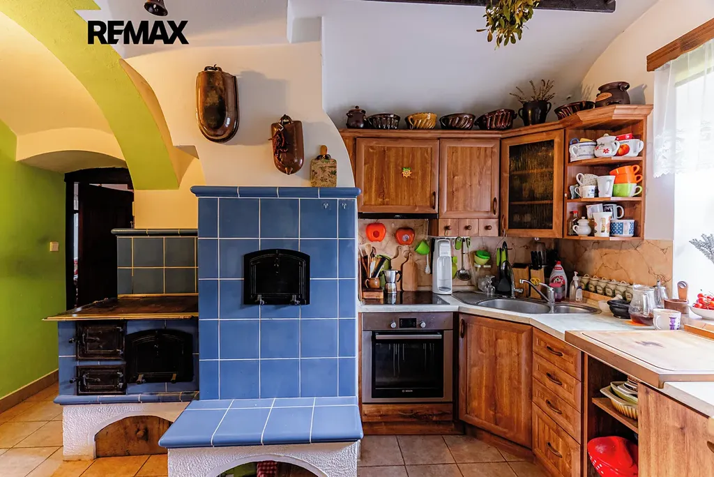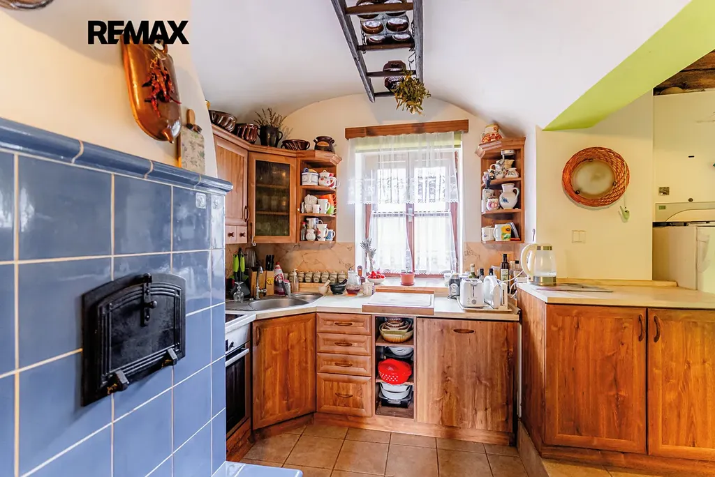 V interiéru najdete dřevěná okna, přiznané trámy a další autentické prvky, které dodávají domu jedinečný charakter jako například přiznaná stěna z kamenů v jídelně. V kuchyni jsou původní kachlová kamna, další kamna lze využít i v obytném pokoji. Podlahy v přízemí (kuchyně, chodba a koupelna) jsou temperované.
