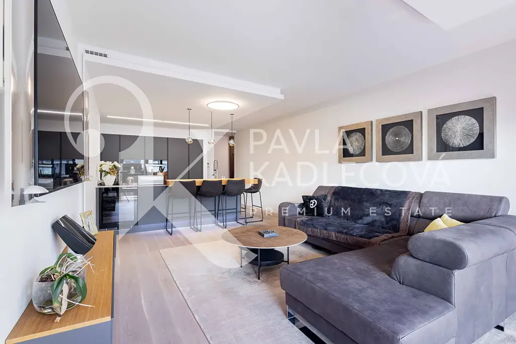Nadstandardní výška dveří, dřevěné podlahy, prvotřídní materiály, venkovní rolety, nábytek na míru a množství precizně zvolených detailů odrážejí cit pro design i důraz na kvalitu. Součástí bytu je také další pokoj, ideální jako dětský pokoj, pracovna nebo pokoj pro hosty.