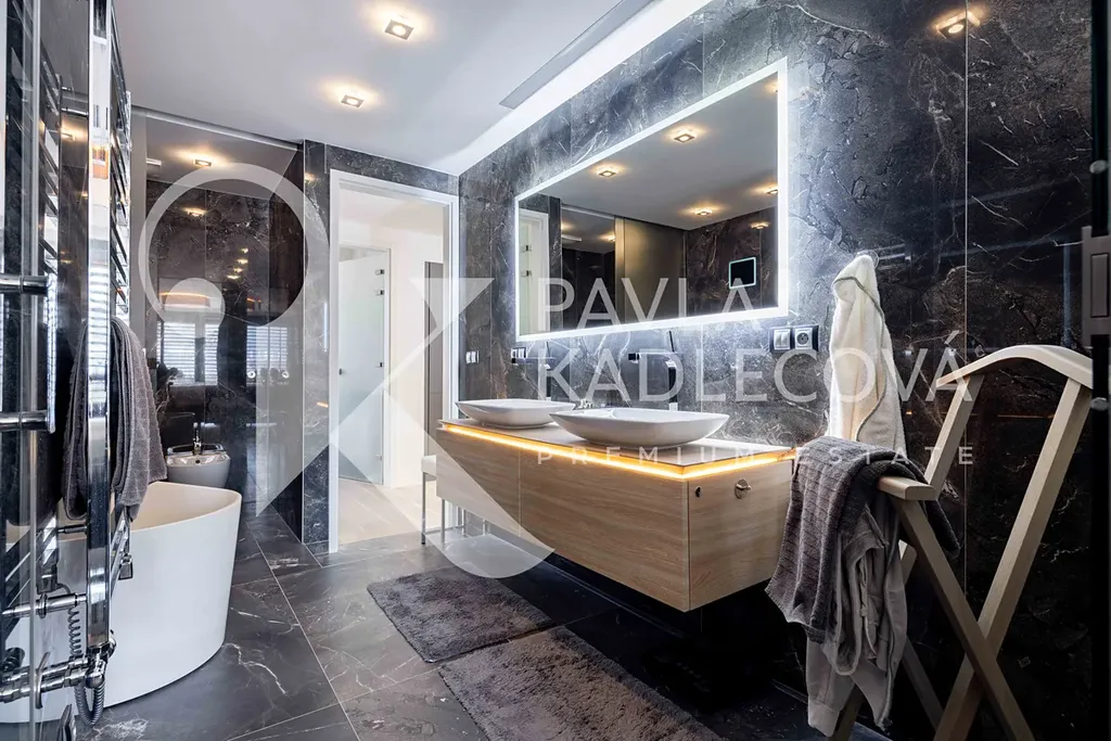 Velkoformátová okna zajišťují dostatek denního světla a podtrhují vzdušnost celého interiéru. Ložnice je propojena s velkorysou koupelnou, kde se nachází prostorný sprchový kout, designová volně stojící vana i dvojumyvadlo. Veškerá sanita a nábytek jsou značky Villeroy & Boch.