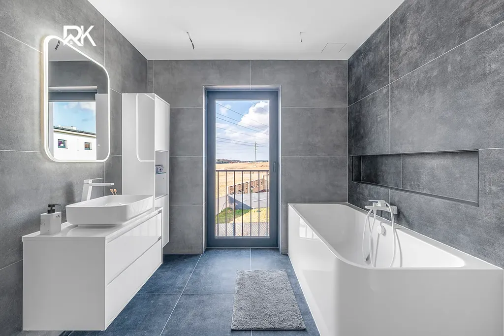 Patro (2. NP): Centrální chodba, ložnice, dětský pokoj, samostatná prádelna s pračkou a sušičkou a prostorná koupelna. Ta disponuje volně stojící vanou a velkoformátovou dlažbou (vybavení v hodnotě 250 000 Kč).