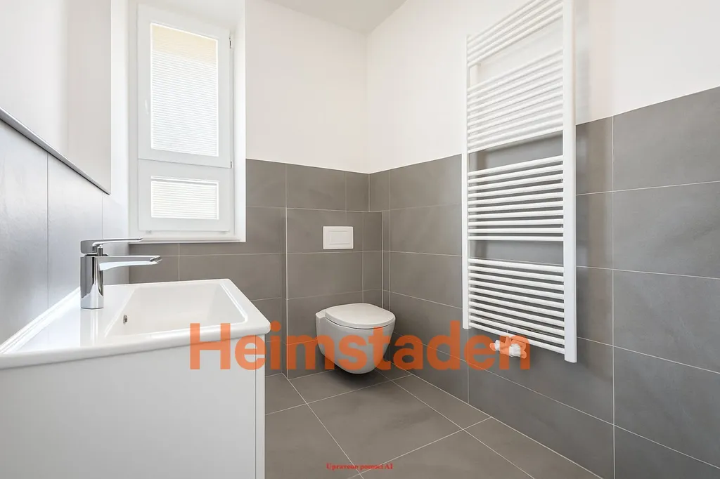 Interiér je laděn do moderních tónů s důrazem na detail – dominantou jsou elegantní šedé obklady, které dodávají prostoru nadčasový vzhled. Koupelna je řešena velmi prakticky a vkusně: sprchový kout, závěsné WC (Geberit) a kvalitní sanitární vybavení tvoří funkční celek.