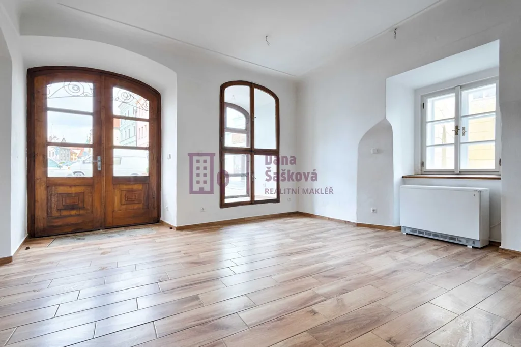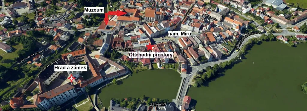 Pronájem obchodních prostor na nám. Míru v Jindřichově Hradci. Prostory se nachází v přízemí historického domu, který stojí na frekventované spojnici mezi náměstím Míru a Státním hradem a zámkem Jindřichův Hradec. Celková plocha 50 m2 nabízí prodejní prostor s bezbariérovým vstupem a výlohou, dále zázemí s toaletou a umyvadlem.