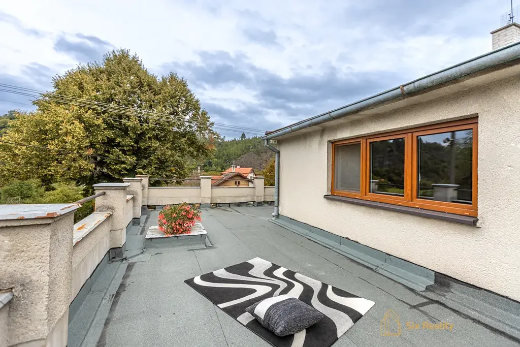 V podkroví je již zrekonstruovaný, světlý byt 4+1 o ploše 112 m², který si můžete ještě rozšířit o terasu o velikosti 39 m². A právě z ní se vám otevře nádherný výhled na skály nad řekou Berounkou – výhled, který se nikdy neokouká.