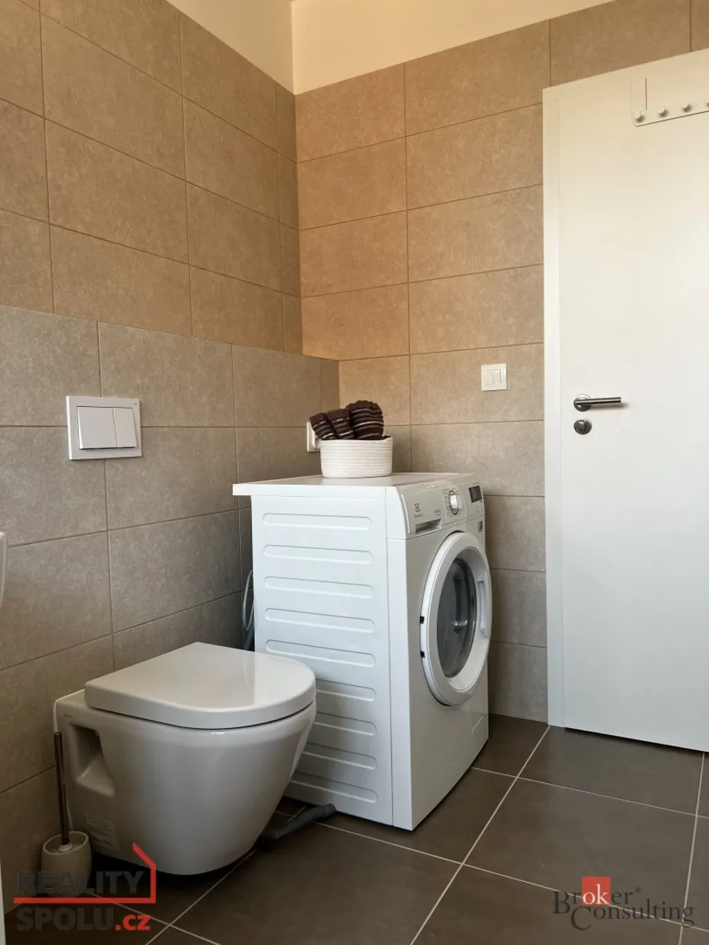 Koupelna je vybavena také pračkou se sušičkou.