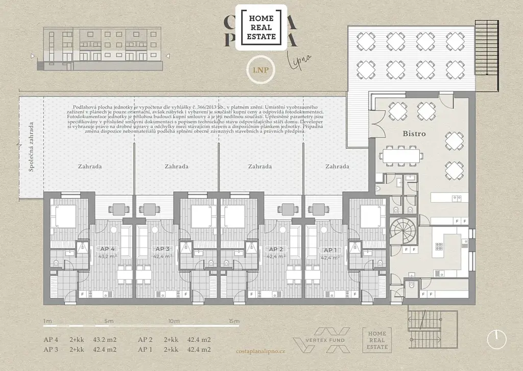 Díky umístění apartmánů ve velmi oblíbené rekreační oblasti, v objektu, který v okolí vyčnívá jedinečností umístění a atmosféry, nebudete mít o zájemce nouzi. Bude možno využít služeb správcovské firmy, která se o pronájem kompletně postará. V přízemí budovy je navíc připraveno bistro, které pro vaše hosty zajistí i snídaně.