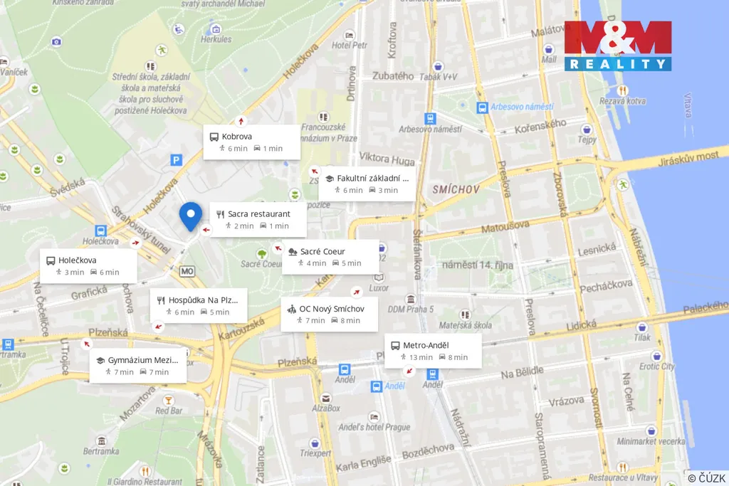 Součástí nemovitosti jsou také 3 parkovací místa v podzemní garáži budovy, vhodná i pro vozy typu SUV. Prostor se nachází v atraktivní smíšené lokalitě nedaleko OC Nový Smíchov, obklopené kancelářskými budovami, rezidenčními komplexy a stabilní klientelou, což nabízí potenciál pro různé podnikatelské záměry. Velkou výhodou je možnost okamžitého převzetí včetně kompletního vybavení, zázemí a zavedeného provozu, přičemž změna podnikatelského záměru je rovněž možná.