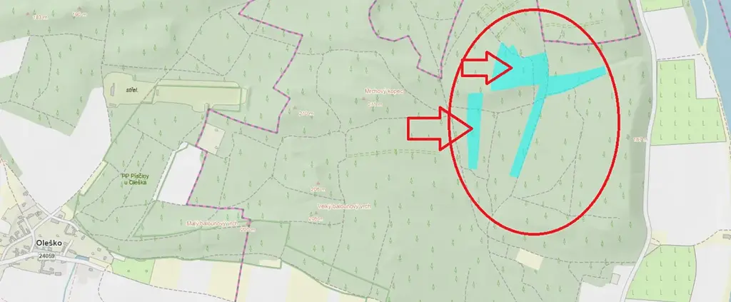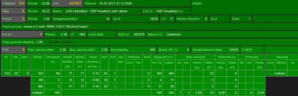 - p.č. 165 vedená jako lesní pozemek o celkové výměře 50 289 m2 (stáří lesa 108 let - zastoupení dřevin akát, borovice, dub, stáří 54 lesa let - zastoupení dřevin borovice, stáří lesa 46 let - zastoupení dřevin borovice, stáří lesa 44 let - zastoupení dřevin borovice, akát, modřín, stáří lesa 24 let - zastoupení dřevin akát).