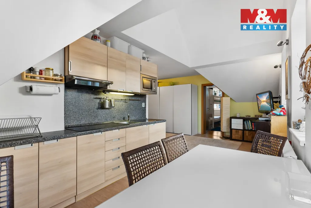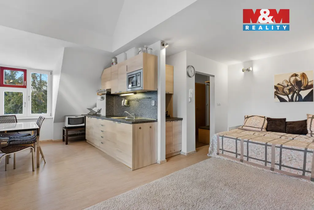 Nabízíme k prodeji krásný prakticky řešený podkrovní byt 2+kk o celkové rozloze 56 m2 + parkovací stání v klidné části města Harrachov. Byt je velmi vkusně zařízený, plně vybavený, poslední roky téměř nevyužívaný. Dispozičně je šikovně řešený tak, aby vznikly 2 samostatné ložnice, ale zároveň byl zachován obývací pokoj s kuchyňským koutem. V bytě je dále koupelna (s podlahovým vytápěním) se sprchovým koutem a WC a komora přístupná z chodby. Nemovitost se nachází v uzavřeném bytovém resortu Resident Harrachov, kde je též i parkovací stání patřící k bytu vymezené samostatným parcelním číslem. K bytu dále patří sklep v suterénu domu. Samotná nemovitost je zděná, ve velmi dobré kondici s vlastní kotelnou. Celý komplex se nachází v klidné části města přitom s výbornou dostupností do centra. Lyžařské středisko je cca cca 1,5 km, bobová dráha a lanové centrum 300m. Pokud hledáte útulný plně vybavený apartmán na klidném místě, ale v srdci Krkonoš, pak je pro Vás tato nemovitost ideální.