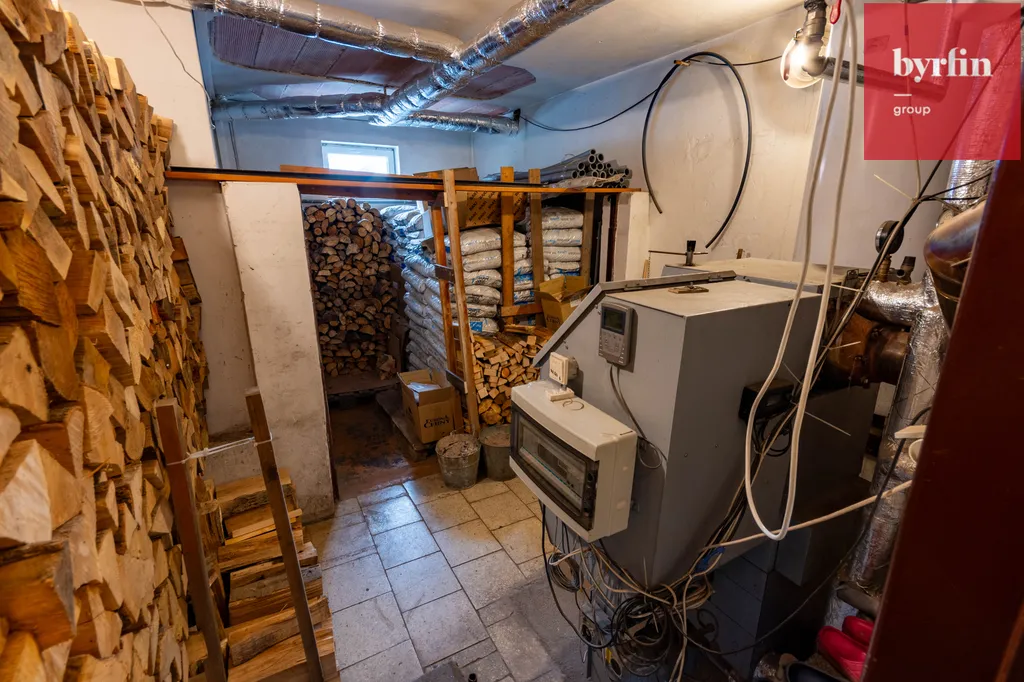garáž pro 2 vozy (za sebou), dílnu, letní kuchyň, kotelnu, prádelnu se sprchou, sklad dřeva a WC.
