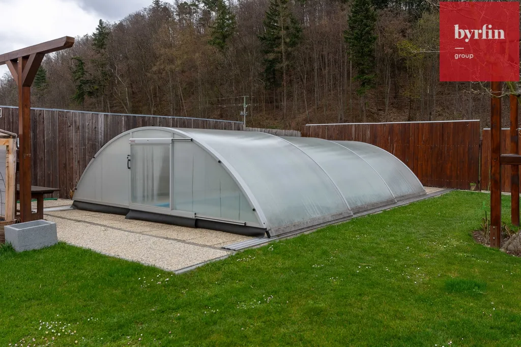 krytou terasu s posezením (29 m²), krytý bazén, zahradní chatku, dřevník, záhony, vzrostlou zeleň.