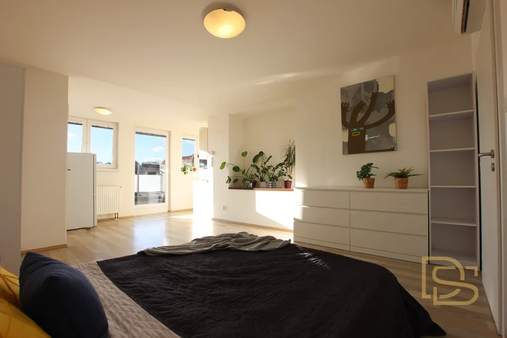 Nabízíme k podnájmu podkrovní byt o dispozici 2+kk s výměrou 48 m2 a prostornou terasou s hezkým výhledem, který se nachází ve vyhledávané lokalitě na ulici Veveří.