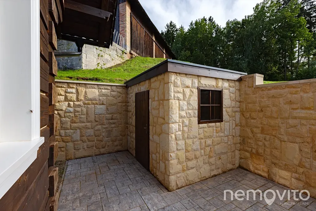 Dvoupodlažní dům s dispozicí 4+kk a dvěma koupelnami má nad celým půdorysem prostornou půdu a taky venkovní zahradní domek, který je stejně jako celá opěrná zeď obložen pískovcem. Všechny tři ložnice se nachází nahoře, dole je tak především společenská část domu s koupelnou, ve které je zakomponována sauna. Vytápění je dole řešeno podlahovkou, případně pak krásnými kachlovými kamny. V domě je dostatek světla díky soustavě velkých oken a kdo by snad zatoužil po zimní zahradě, zastřešený prostor nabízí velká terasa s přesahem střechy.