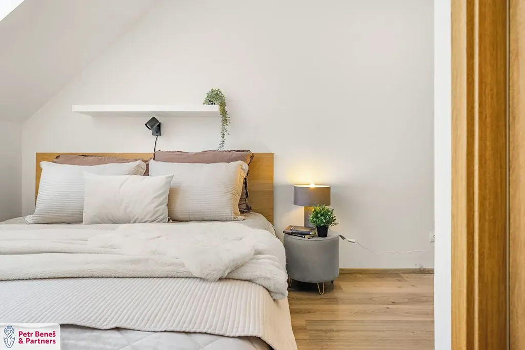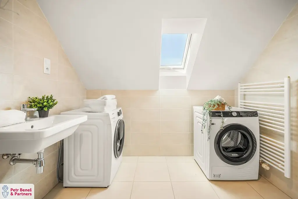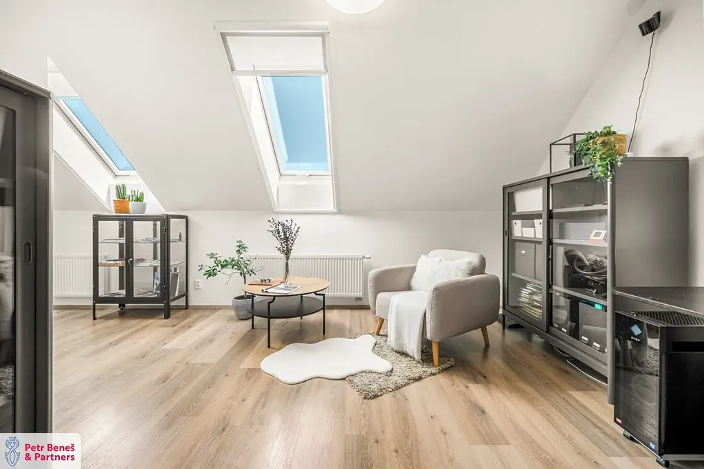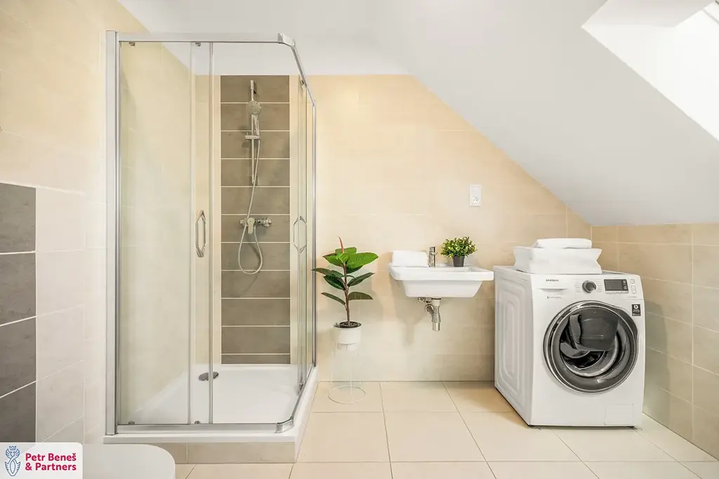 Samotný byt je řešený jako mezonet, takže prostor působí vzdušně a přirozeně odděluje denní a klidovou část. Nechybí dvě koupelny, což je věc, kterou oceníte každý den, aniž byste o ní museli přemýšlet.