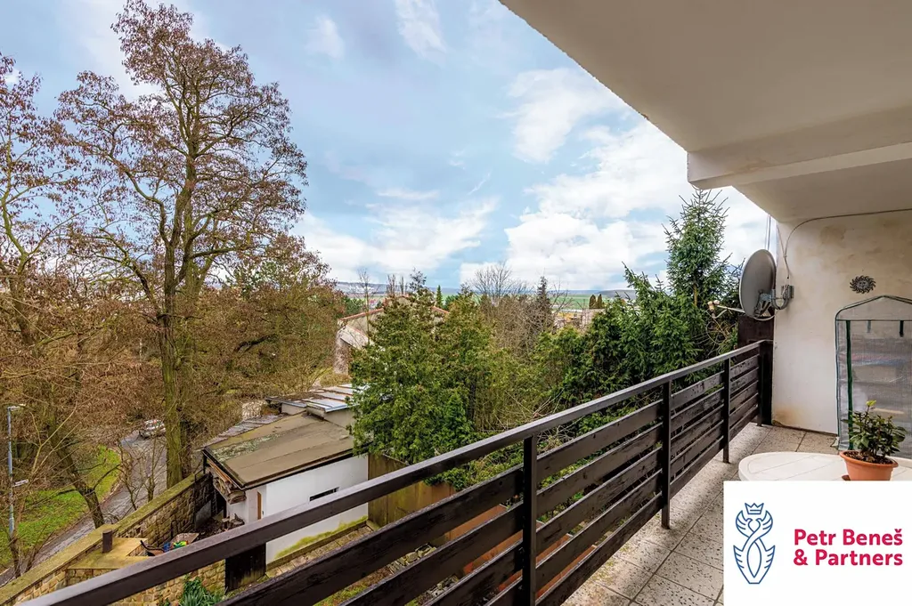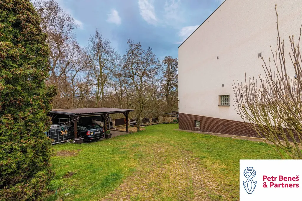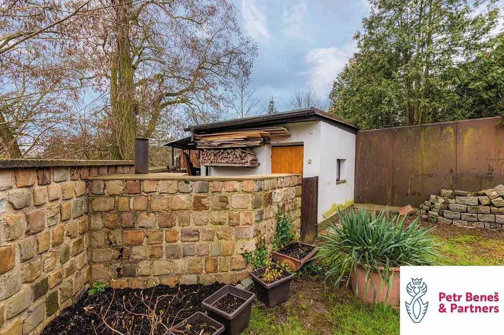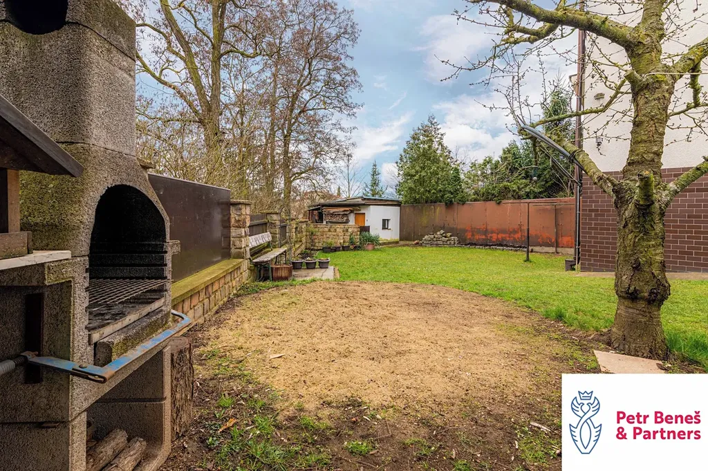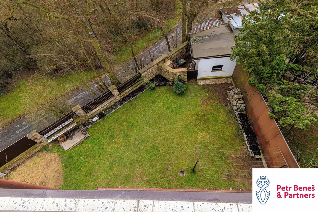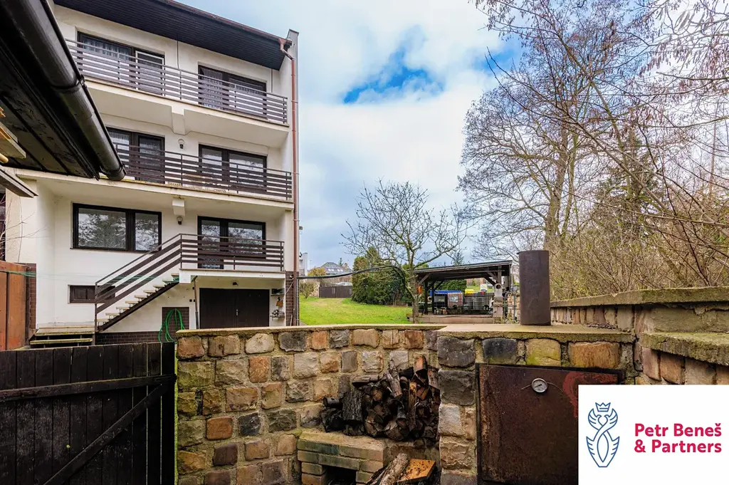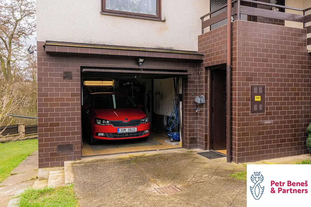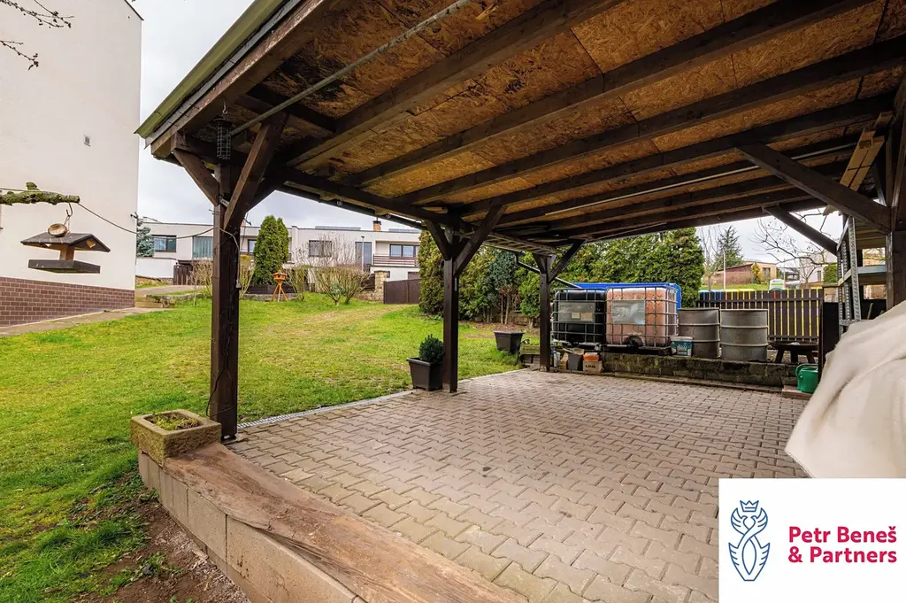 Za domem pergola na posezení, k tomu zahradní domek, dvě garáže (jedna vpředu, druhá vzadu)… a když si k tomu přidáte ty výhledy a fakt, že jste za pár minut v centru města, začne to celé zapadat.