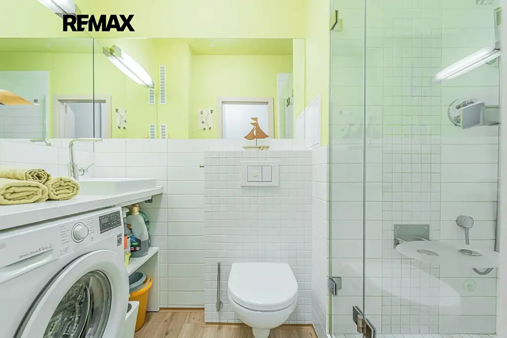 Koupelna je opatřena sprchovým koutem, umyvadlem, pračkou a WC.