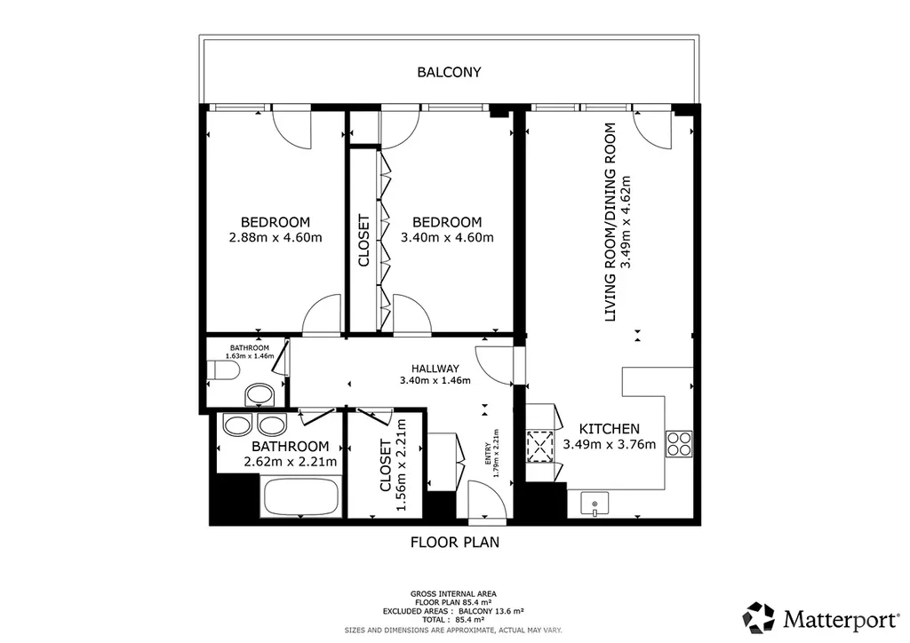 Dominantou bytu je prostorný obývací pokoj s moderním kuchyňským koutem, který nabízí opravdu velkorysou pracovní i úložnou plochu – ideální pro každého, kdo rád vaří nebo tráví čas s rodinou. Kuchyně je vybavena všemi vestavnými spotřebiči včetně indukční desky, trouby, mikrovlnné trouby, myčky i lednice s mrazákem. Dispozice dále zahrnuje dvě samostatné ložnice, přičemž nechybí dostatek úložných prostor – vestavěná skříň v předsíni, velká šatní skříň v ložnici a samostatná místnost vhodná jako šatna či komora. Koupelna a toaleta jsou oddělené, což přispívá k vyššímu komfortu bydlení.