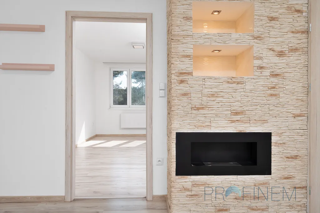 Interiér bytu je světlý, vzdušný a voní novotou. Dispozice: ložnice, obývací pokoj s designovým krbem na biolíh, plně vybavená kuchyně s jídelním koutem, koupelna, samostatné WC a předsíň. Kuchyň vás nadchne svou praktičností a vybavením – je tu myčka, indukční deska, trouba, lednice i dostatek úložného prostoru. Všechna okna mají stylové rolety den/noc, které dodávají bytu útulný i moderní vzhled. Teplo i teplou vodu zajišťuje nový plynový kotel. A navíc – k bytu patří dva sklepy, kam uložíte kola, sportovní věci nebo cokoliv sezónního.