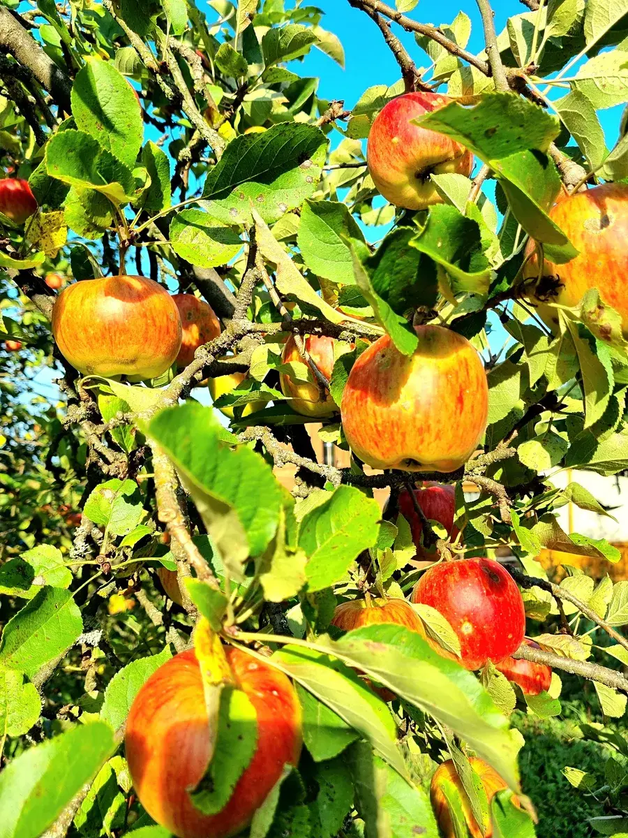 Zahrada je mírně svažitá a rostou na ní plodící stromy, keře a okrasné rostliny.
