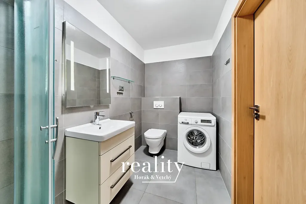 V koupelně je WC, sprchový kout a připojení na pračku/sušičku.