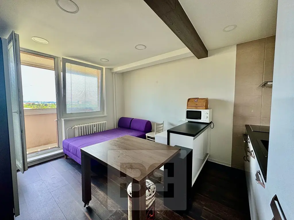 Ve výhradním nabízíme k podnájmu zrekonstruovaného bytu1+kk v Brně - Žabovřeskách. Byt se nachází na ulic Vychodilova v 12.NP s výtahem. Byt o celkové velikosti 25m2 včetně balkonu, odkud je krásný výhled do okolí. Obývací část je vybavena jídelním stolem s židlemi, komodami, sedačkou a skříní. V kuchyni je lednice, mrazák a el. sporák, trouba, digestoř i myčka. Opravdu velmi dobře a pěkně vybaveno a zařízeno. Zajimvě je řešeno i osvětlení bytu, které navodí krásnou atmosféru večer. Součástí koupelny je sprchový kout, WC a pračka. V bytě jsou nové plovoucí podlahy s kombinací s dlažbou v koupelně a předsíni. Byt prošel kompletní rekonstrukcí včetně podkladů, elektřiny a nových stěn. K bytu náleží sklepní kóje o vel. 2,5m2.